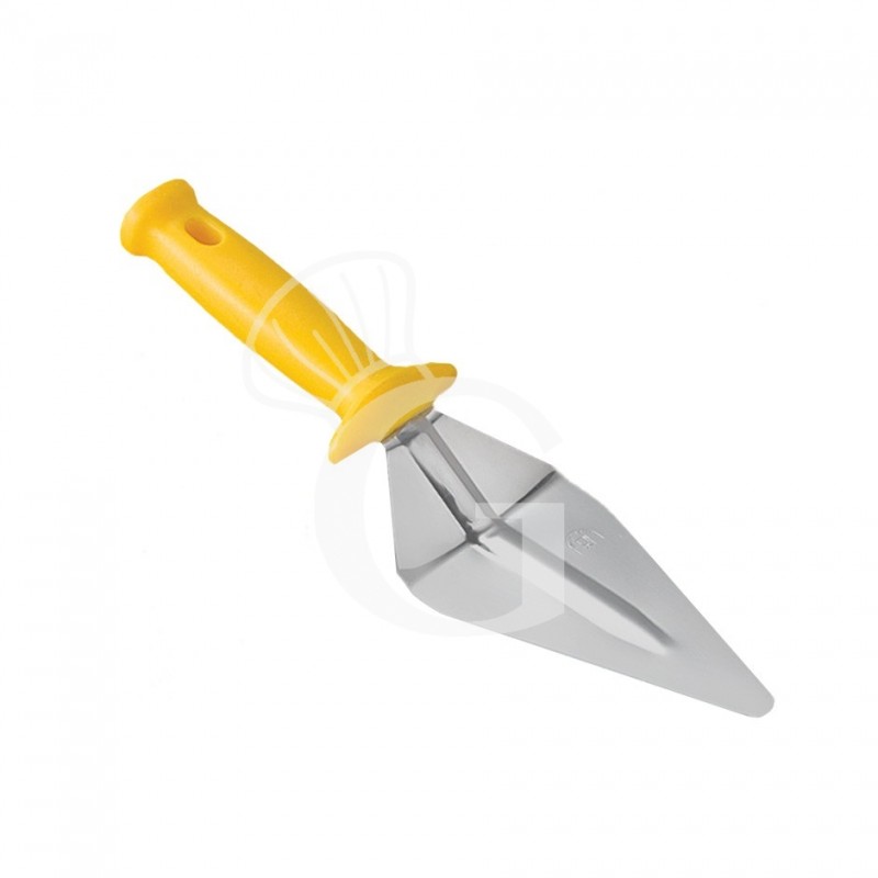 Pala triangular para pizza de acero inoxidable con mango ergonómico de polipropileno.