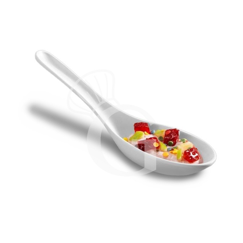 Cuchara individual de melamina, una resina sintética que se endurece y toma forma tras el calentamiento. Es un material recomendado y utilizado para los servicios de mesa y buffet.