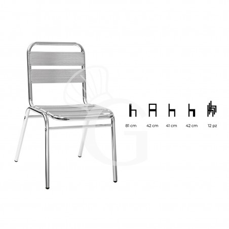 Silla Palma con estructura, asiento y respaldo de aluminio anodizado. Dimensiones de 420 mm x 410 mm x 810 mm.