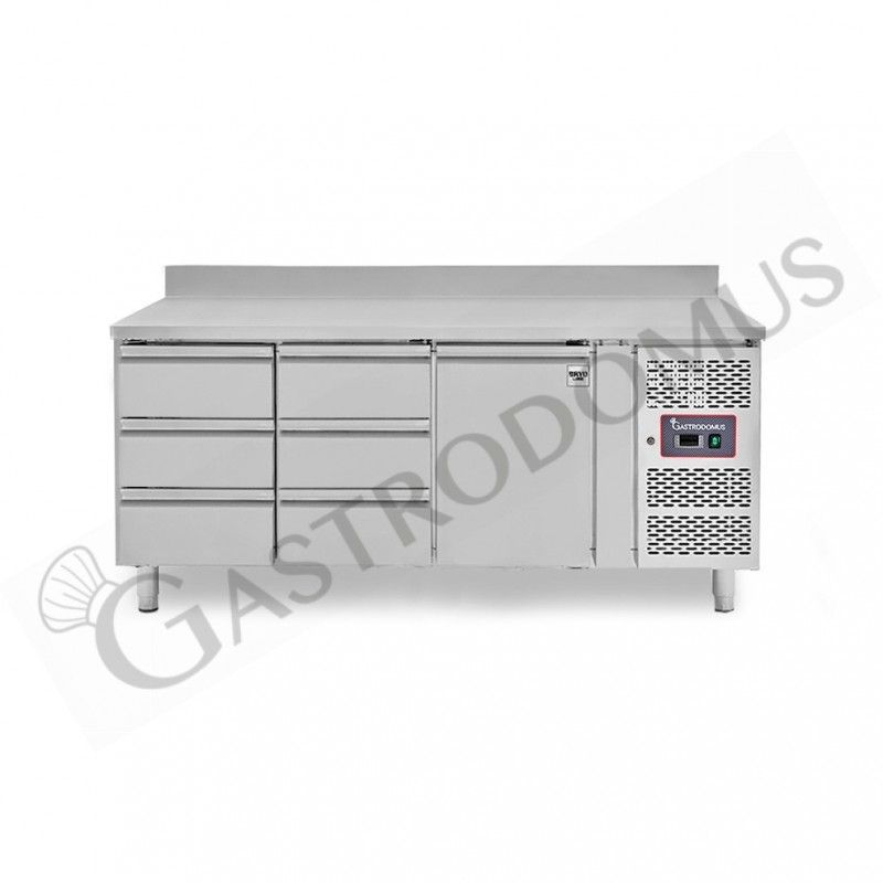 Mesa refrigerada con 1 puerta, 6 cajones 1/3 a la izquierda y peto, profundidad 700 mm, temperatura -2°C/+8°C.