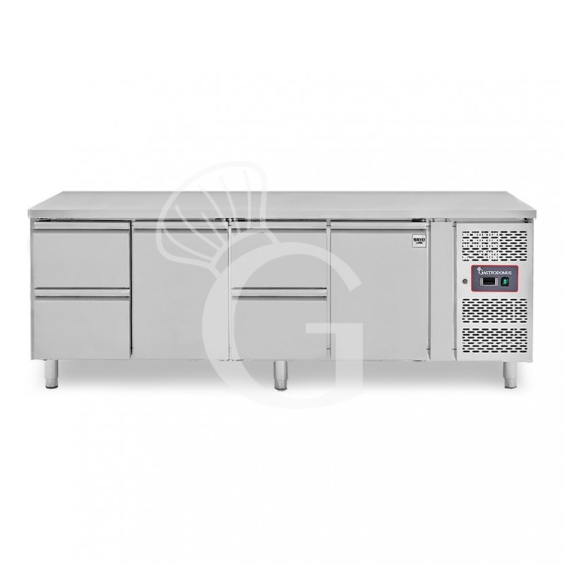 Mesa refrigerada con 2 puertas, 2 cajones a la izquierda de 1/2 y 2 cajones centrales a la derecha de 1/2, profundidad 700 mm, temperatura -2°C/+8°C.