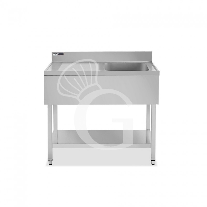 Fregadero con bastidor de acero inoxidable con 1 cubeta y escurridor a la izquierda, estante y peto trasero L 1200 mm x P 600 mm x A 965 mm, con agujero para el grifo Ø 32 mm.