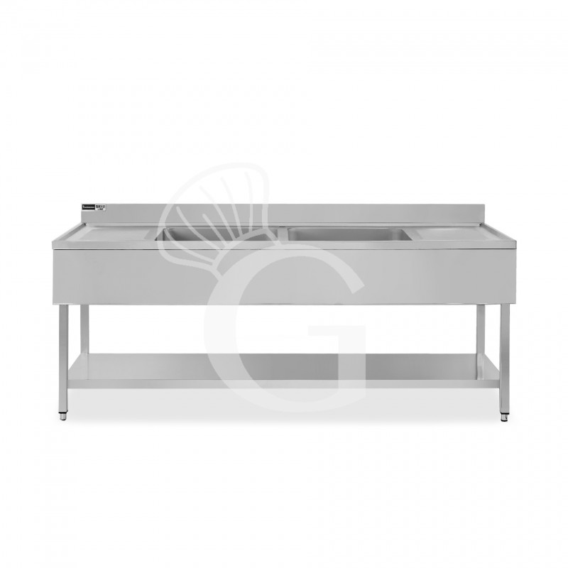 Fregadero con bastidor de acero inoxidable con 2 cubetas y 2 escurridores, estante, peto trasero L 2000 mm x P 700 mm x A 965 mm, con agujero para el grifo Ø 32 mm.