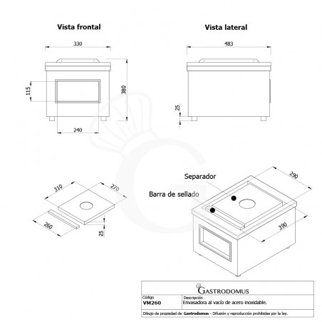 Está equipada con una barra de sellado de 260 mm que se puede levantar para facilitar la limpieza y una palanca lateral para cerrar la tapa.