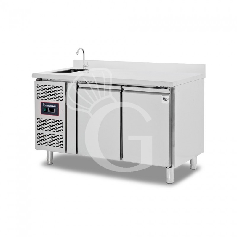 Mesa refrigerada 2 puertas con fregadero y peto, motor izquierdo, Prof. 700 - temperatura -2°C/+8°C grifo en dotación