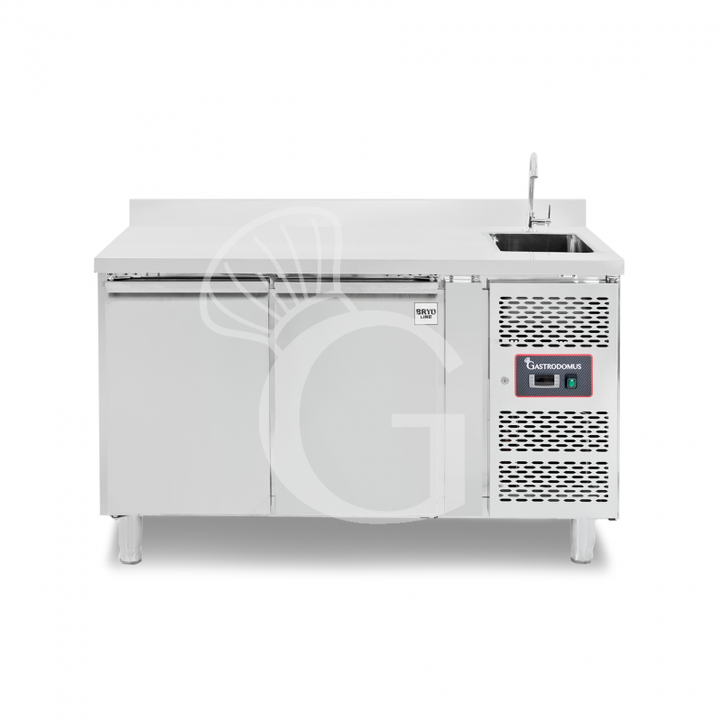 Mesa refrigerada 2 puertas con fregadero y peto motor derecho, Prof. 700 mm, Temp -2°C/+8°C con grifo en dotación