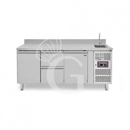 Mesa fregadero refrigerada con peto equipada con 2 cajones y 2 puertas, profundidad 700 mm, temperatura +2°C/+8°C - grifo Ø 25 mm.