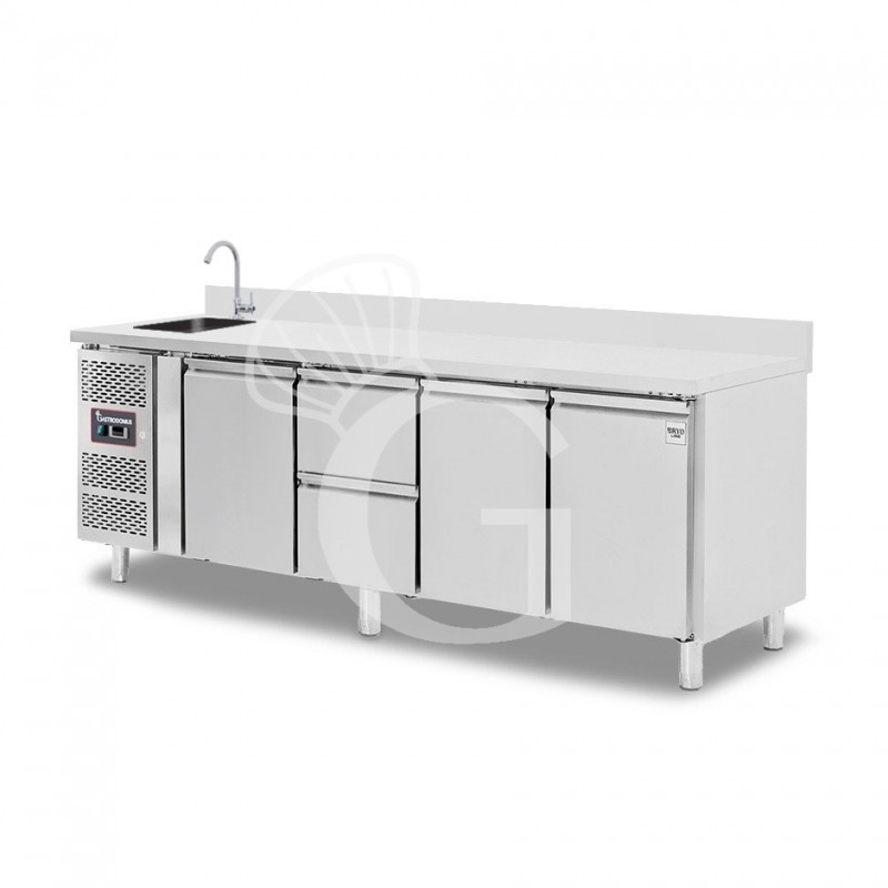 Mesa refrigerada con fregadero provista de 2 cajones y 3 puertas con peto, profundidad 700 mm, temperatura +2°C/+8°C, grifo Ø 25 mm.