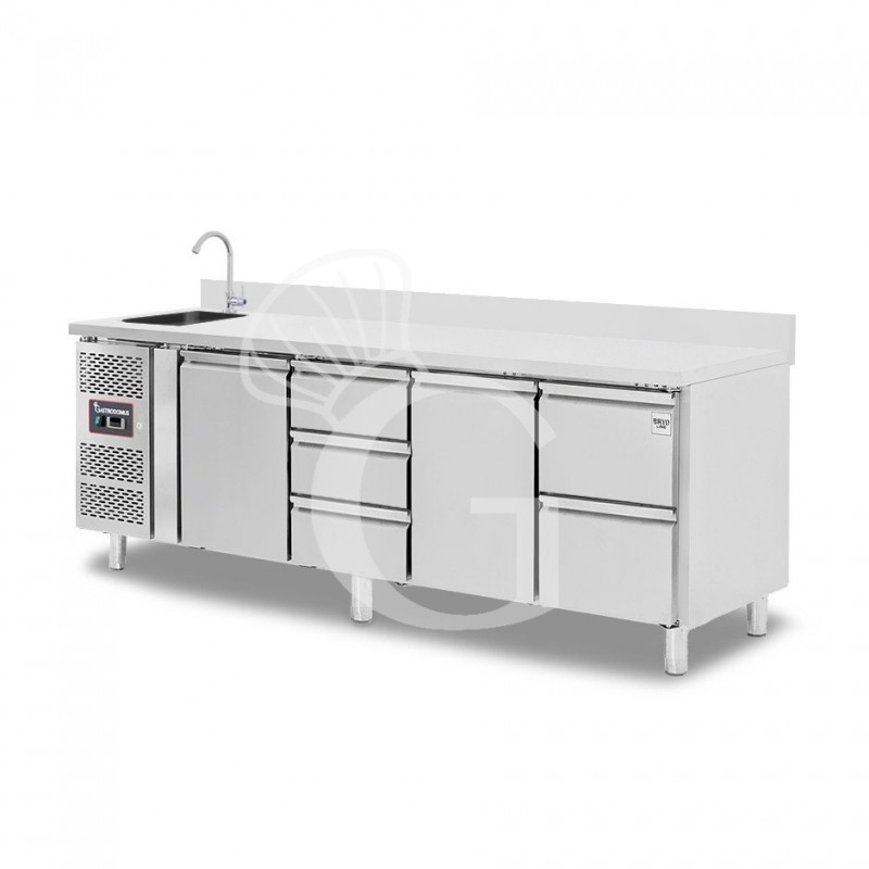 Mesa refrigerada 5 cajones 2 puertas con fregadero y peto, motor a la izquierda, Prof. 700 mm, temp. +2°C/+8°C, con grifo.
