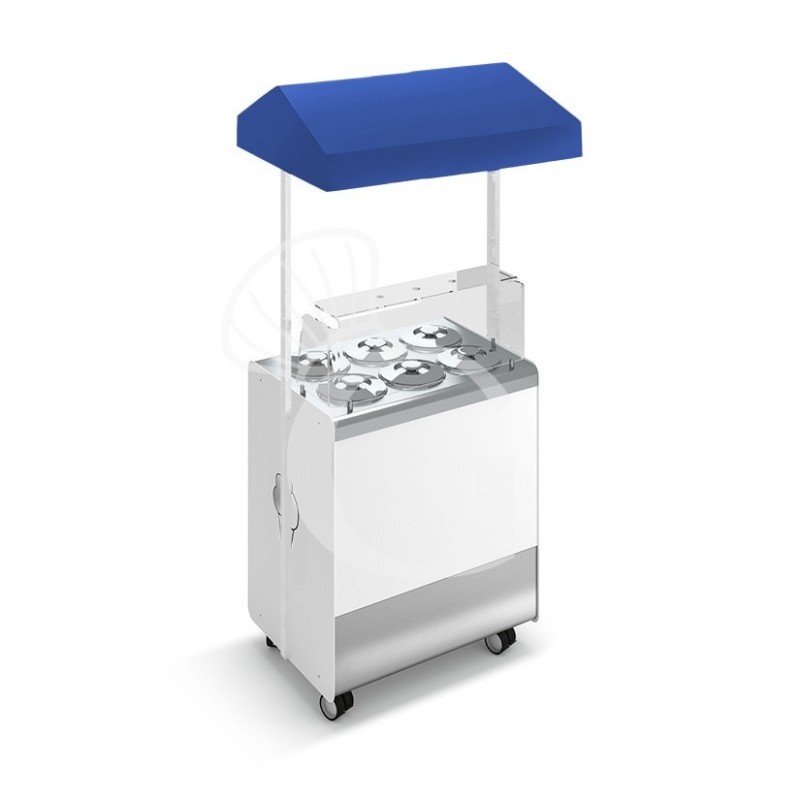 Vitrina helados ventilada, ruedas Joy 6 cubetas cilíndricas con reserva, toldo telescópico azul, L 866 x P 856 x H 2170 mm