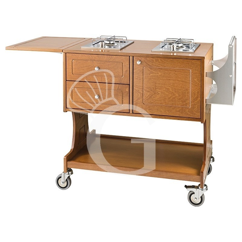Carro de servicio Flambé con 2 placas de un fuego separadas, color nogal, L 1450 mm x P 580 mm x H 910 mm
