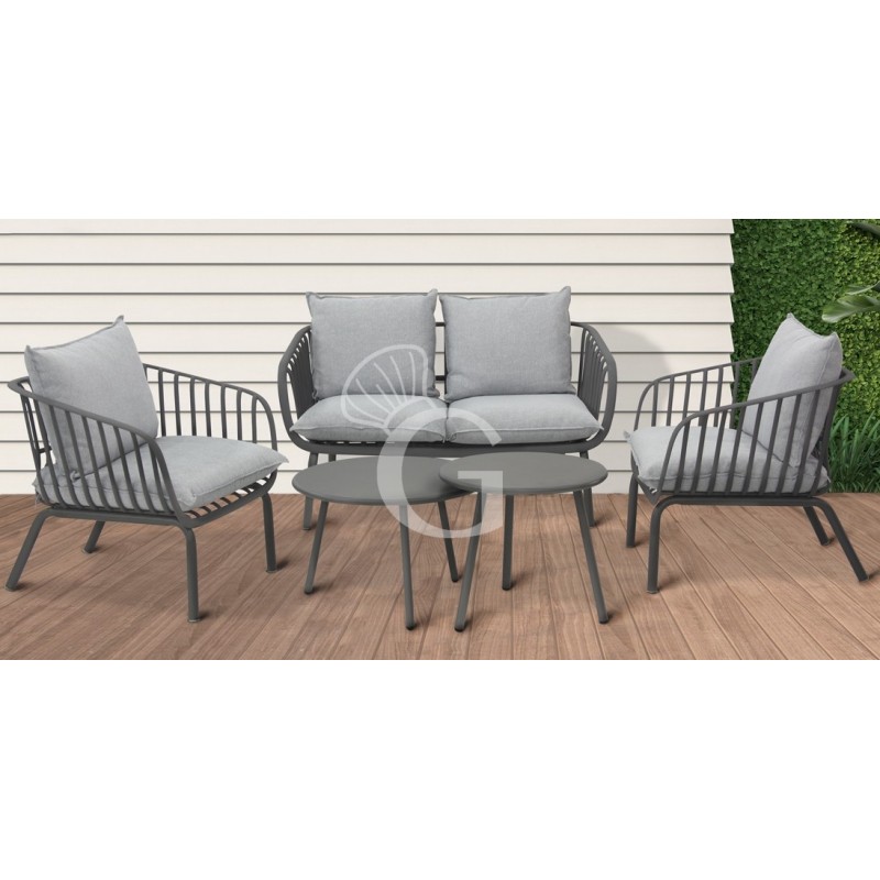 Mesas redondas de metal pintado, sillones y sofá con estructura de metal pintado y estructura de polipropileno con cojines hidrorrepelentes.