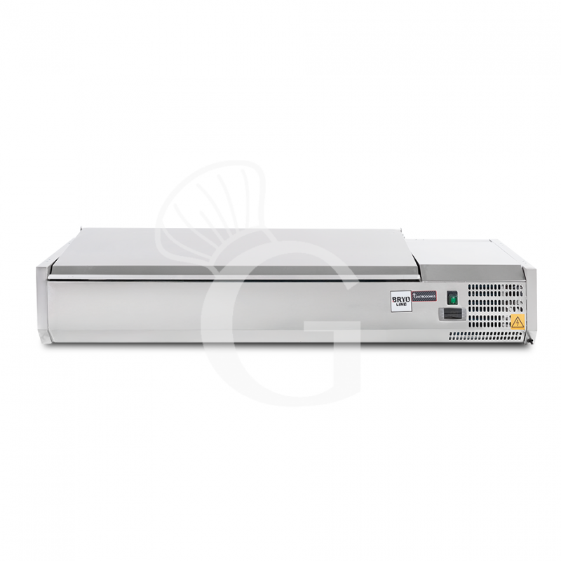 Vitrina refrigerada con tapa de acero inoxidable L 1400 mm para 4 cubetas GN 1/3 + 1 cubeta GN 1/2.