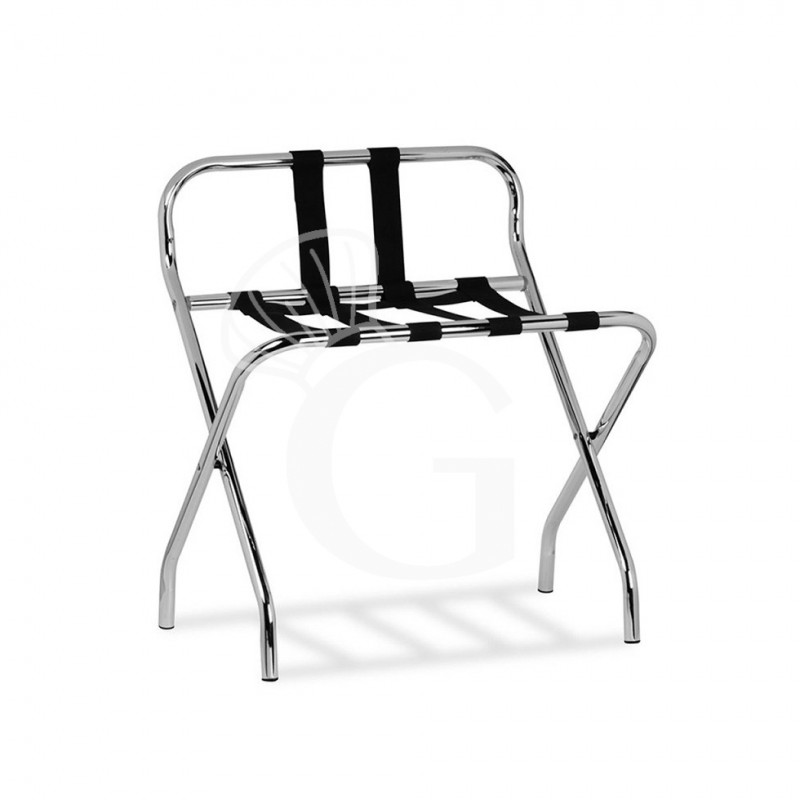 Portaequipajes con estructura plegable en tubo de acero cromado y correas desmontables de PVC de color negro. Patas de goma antirrayaduras.