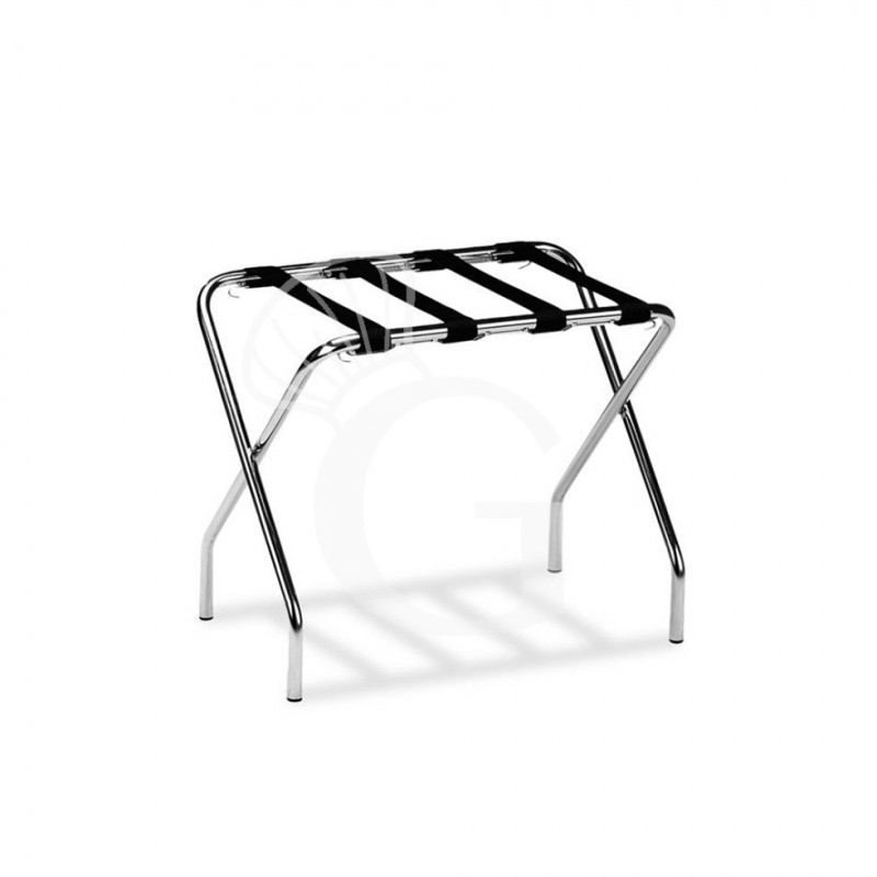 Portaequipajes con estructura plegable en tubo de acero cromado y correas desmontables de PVC de color negro. Patas de goma antirrayaduras.
