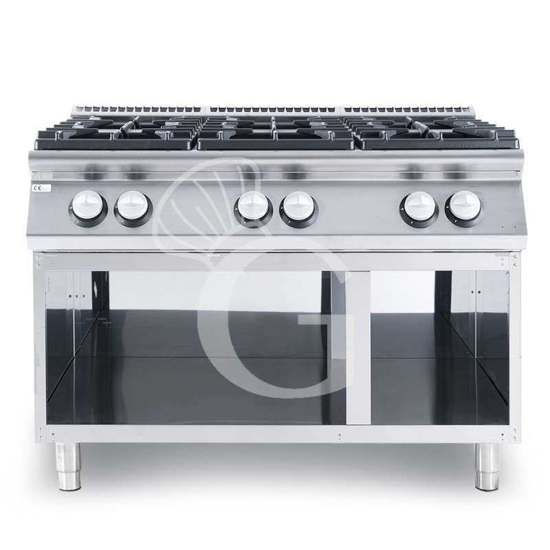 Cocina de gas profesional con 6 fuegos, armario abierto, profundidad 900 mm