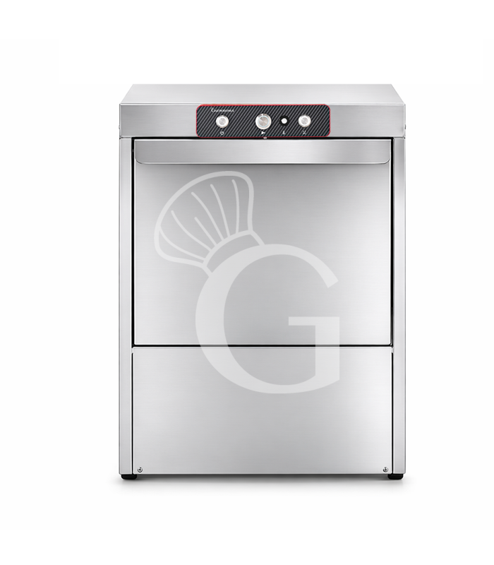 Lavavajillas profesional electromecánico trifásico con cesta cuadrada de 500 x 500 mm, dosificador de detergente y dosificador de abrillantador instalados, con doble pared y bomba de desagüe.