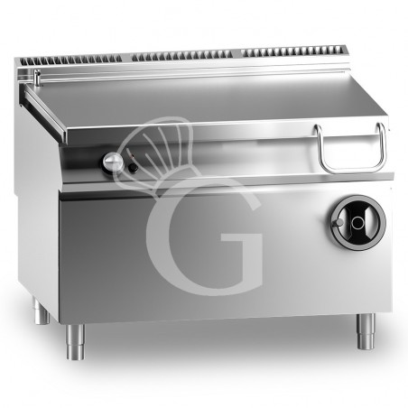 Sartén basculante a gas sobremueble con apertura manual, con una capacidad de 120 litros.