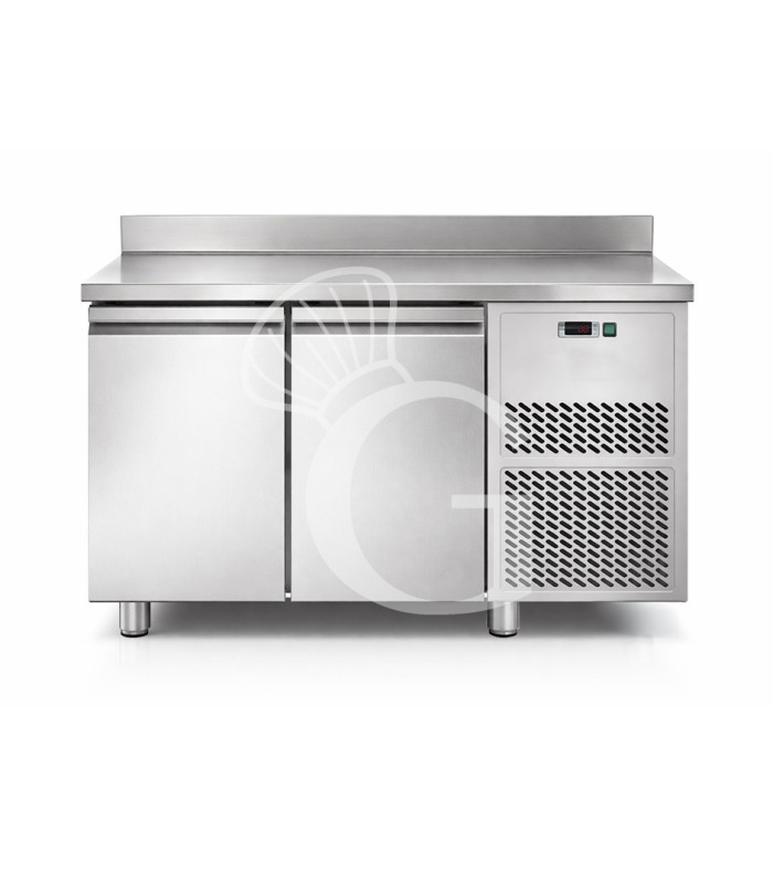 Mesa refrigerada con 2 puertas, peto trasero, profundidad 600 mm y temperatura -18°C/-22°C.