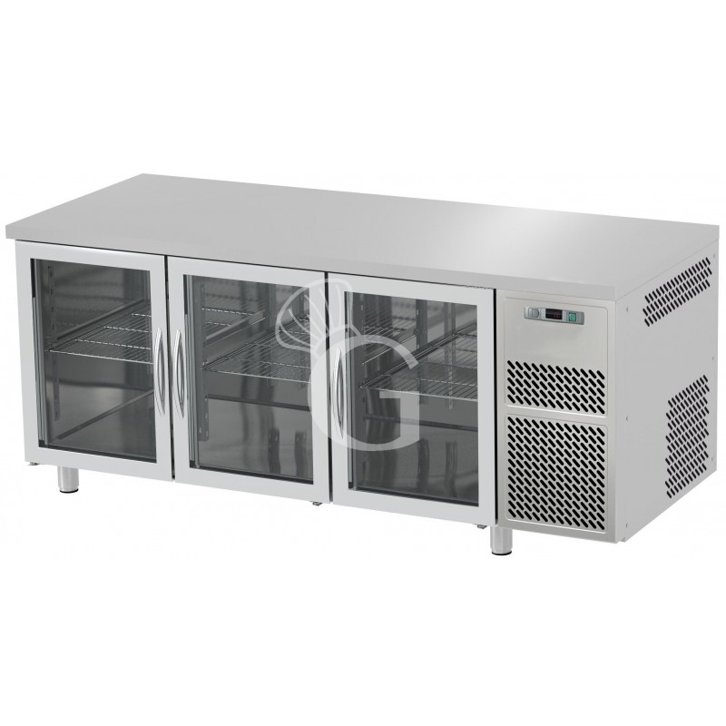 Mesa refrigerada prof. 600 mm, con 3 puertas de cristal, temperatura 0°C/+10°C y encimera de acero inoxidable.