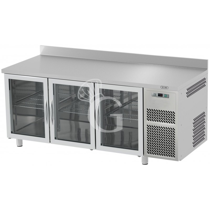 Mesa refrigerada prof. 600 mm y peto trasero, con 3 puertas de cristal, temperatura 0°C/+10°C y encimera de acero inoxidable.