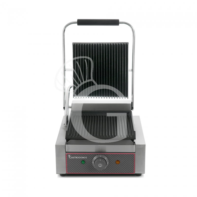 Sandwichera profesional simple de hierro fundido con superficie de cocción ranurada, L 310 mm x P 380 mm x aA 210/520 mm.