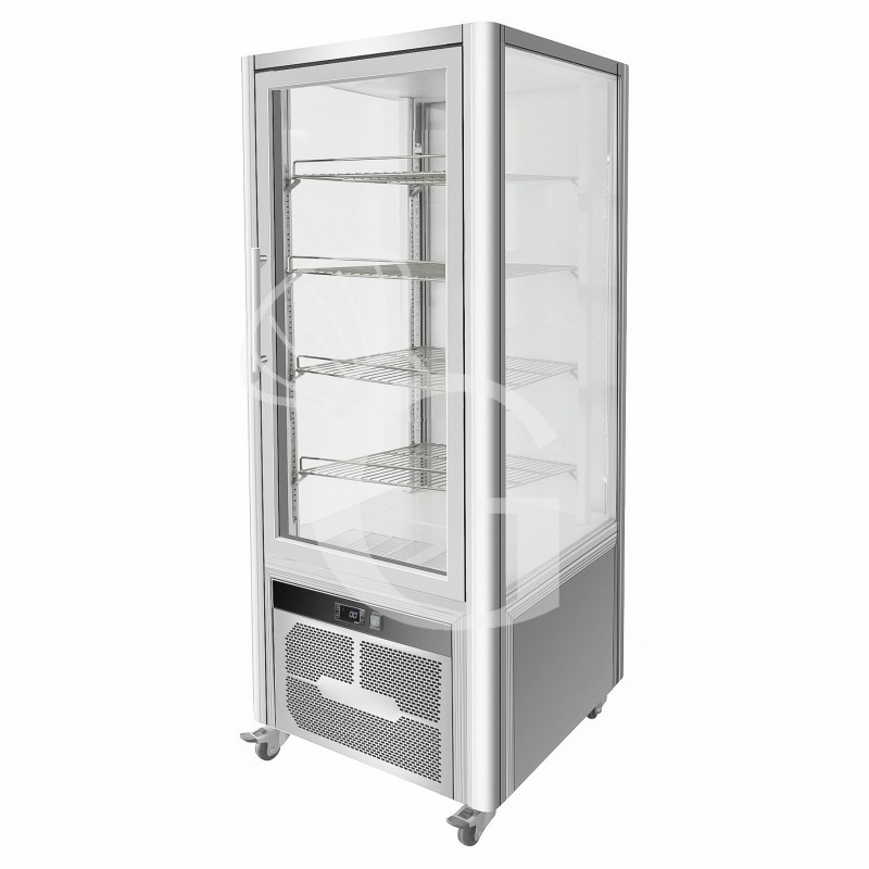 Vitrina refrigerada para pastelería con 4 estantes, capacidad de 408 litros y temperatura ajustable de +2°C/+8°C.