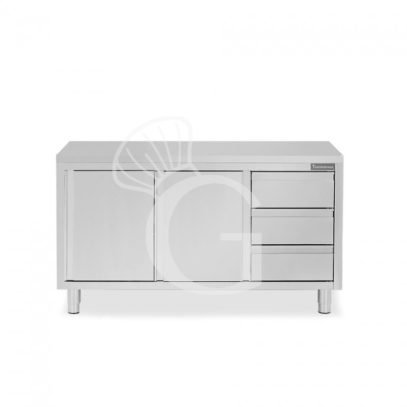 Mesa mural de acero inoxidable con 2 puertas correderas, 3 cajones a la derecha L 1800 mm x P 600 mm x A 850 mm