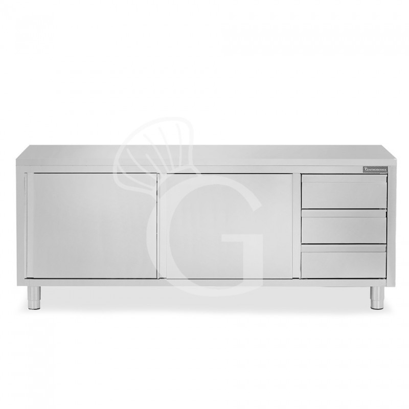 Mesa mural de acero inoxidable con 2 puertas correderas, 3 cajones a la derecha L 2400 mm x P 600 mm x A 850 mm