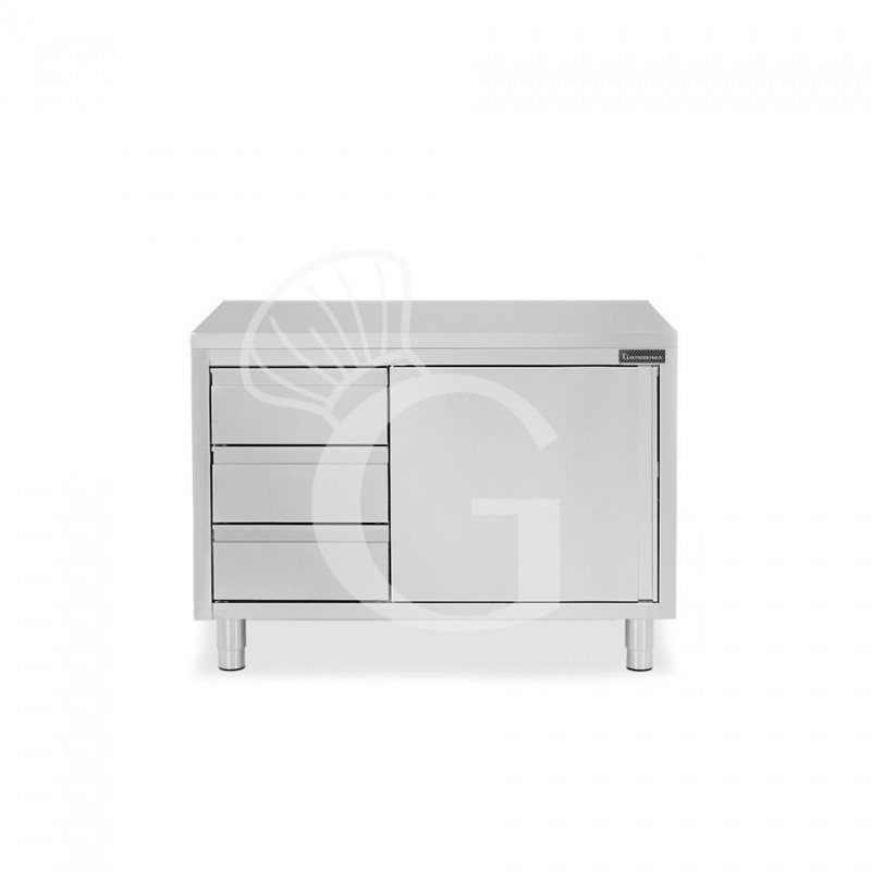 Mesa mural de acero inoxidable con 1 puerta batiente, 3 cajones a la izquierda L 1000 mm x P 600 mm x A 850 mm