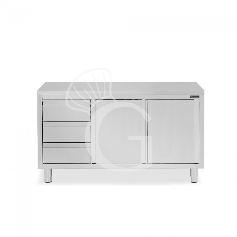 Mesa mural de acero inoxidable 2 puertas correderas, 3 cajones a la izquierda L 1700 mm x P 700 mm x A 850 mm