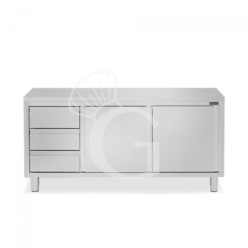 Mesa mural de acero inoxidable con 2 puertas correderas, 3 cajones a la izquierda L 2100 mm x P 700 mm x A 850 mm