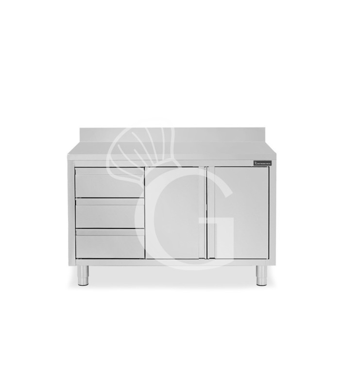 Mesa mural de acero inoxidable con 2 puertas correderas, 3 cajones a la izquierda y peto trasero L 1400 mm x P 600 mm x A 950 mm
