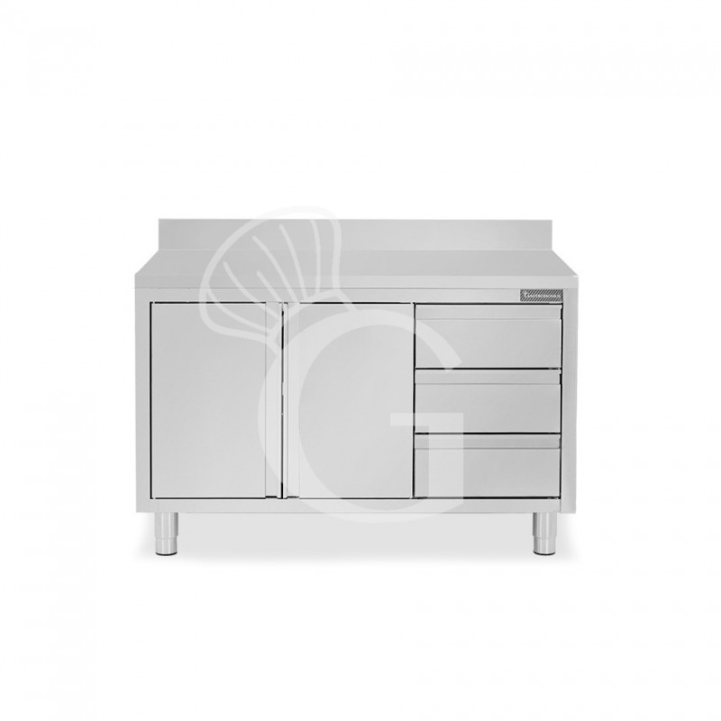 Mesa mural de acero inoxidable con 2 puertas batientes, 3 cajones a la derecha y peto trasero L 1200 mm x P 700 mm x A 950 mm