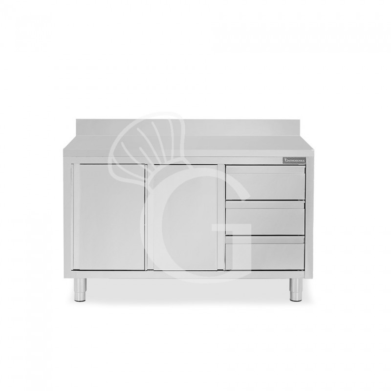 Mesa mural de acero inoxidable con 2 puertas correderas, 3 cajones a la derecha y peto trasero L 1400 mm x P 700 mm x A 950 mm