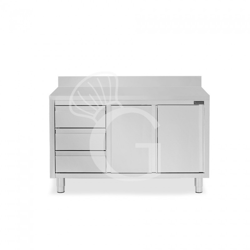 Mesa mural de acero inoxidable con 2 puertas correderas, 3 cajones a la izquierda y peto trasero L 1500 mm x P 700 mm x A 950 mm