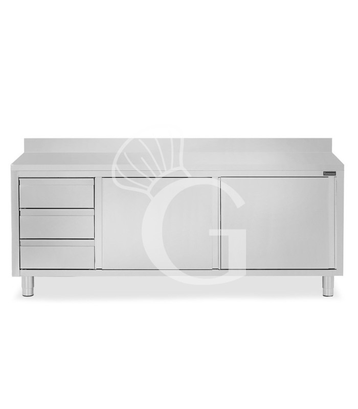 Mesa mural de acero inoxidable 2 puertas correderas, 3 cajones a la izquierda y peto L 2400 mm x P 700 mm x A 950 mm