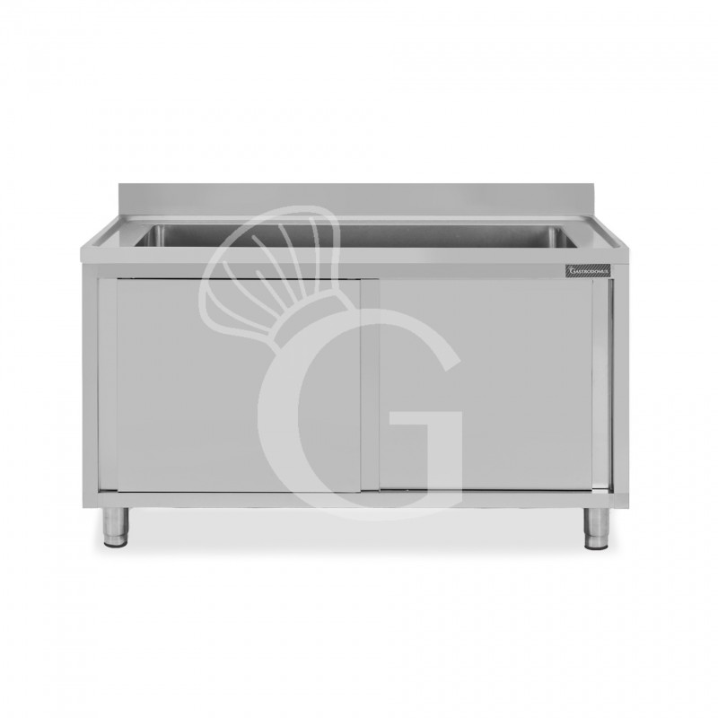 El fregadero tiene un peto trasero y una cuba soldada. El fregadero está colocado sobre un mueble con puertas correderas. Las puertas son huecas y extraíbles.