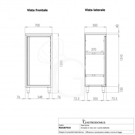 Armario de acero inoxidable con 1 puerta batiente, 2 estantes, L 700 mm x P 500 mm x A 1500 mm.