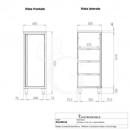 Armario de acero inoxidable con 1 puerta batiente, 3 estantes, L 600 mm x P 500 mm x A 1800 mm.