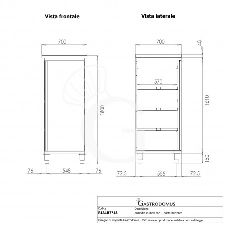 Armario de acero inoxidable con 1 puerta batiente, 3 estantes, L 600 mm x P 700 mm x A 1800 mm.