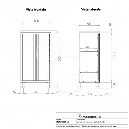 Armario de acero inoxidable con 2 puertas batientes, 2 estantes, L 800 mm x P 500 mm x A 1500 mm.