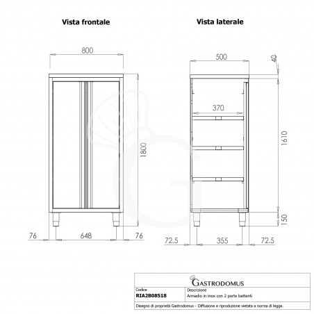 Armario de acero inoxidable con 2 puertas batientes, 3 estantes, L 800 mm x P 500 mm x A 1800 mm.