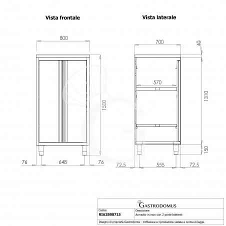 Armario de acero inoxidable con 2 puertas batientes, 2 estantes, L 800 mm x P 700 mm x A 1500 mm.