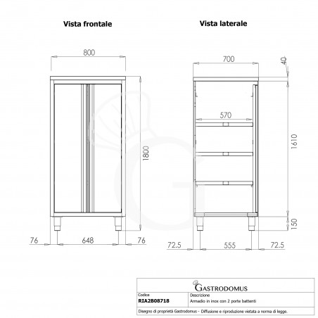 Armario de acero inoxidable con 2 puertas batientes, 3 estantes, L 800 mm x P 700 mm x A 1800 mm.