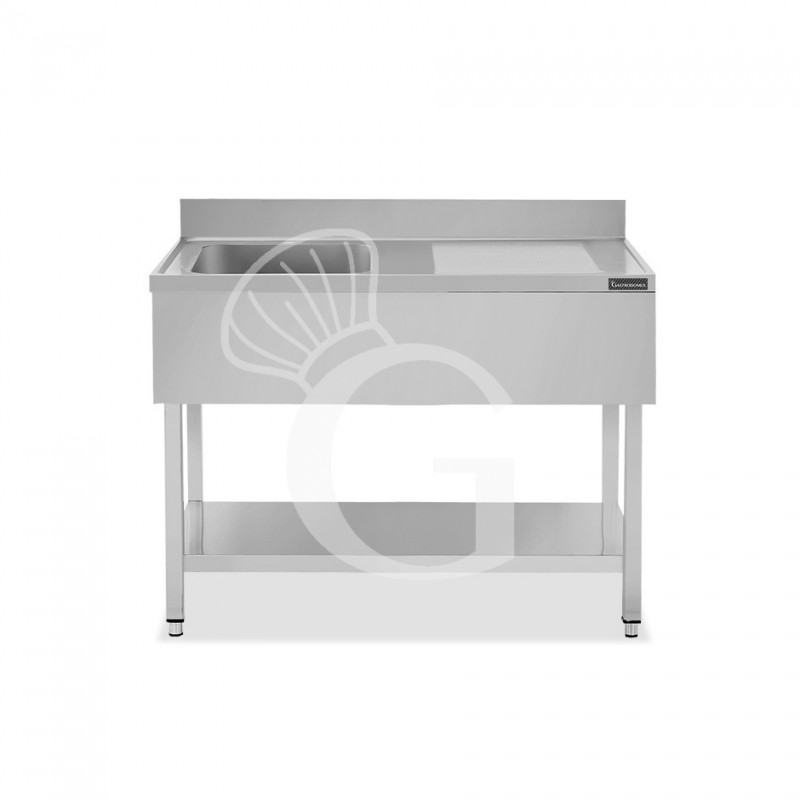 Fregadero inox 1 cubeta y escurridor a la derecha, estante y peto L 1300 mm x P 600 mm x A 950 mm