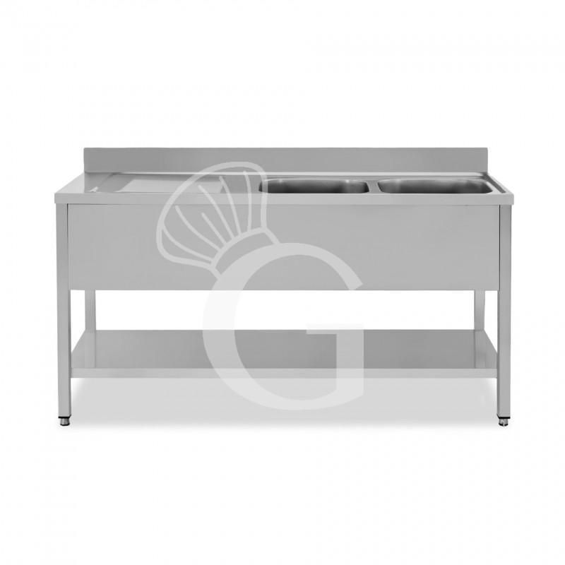 Fregadero con bastidor de acero inoxidable con 2 cubetas y escurridor a la izquierda, estante y peto trasero L 1600 mm x P 600 mm x A 950 mm.