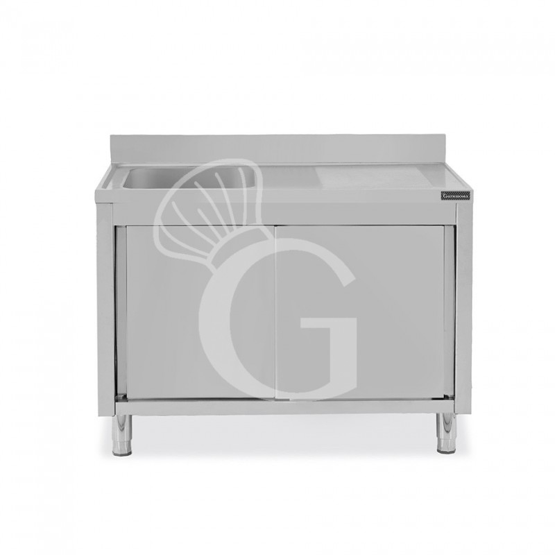 Fregadero con mueble de acero inoxidable con 2 puertas correderas, 1 cubeta, escurridor a la derecha y peto trasero L 1200 mm x P 700 mm x A 950 mm
