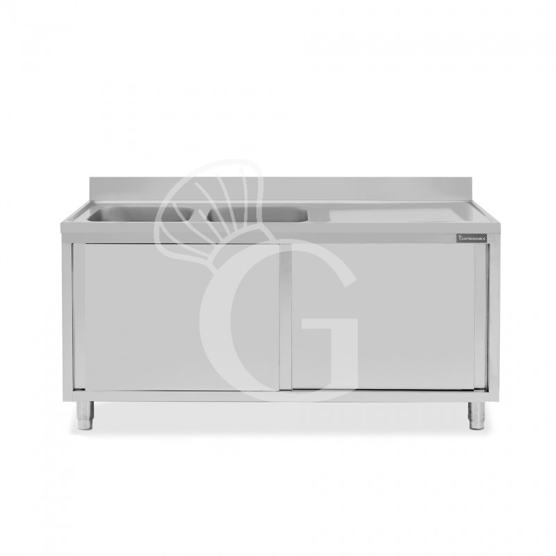 Fregadero con mueble de acero inoxidable con 2 puertas correderas, 2 cubetas, escurridor a la derecha y peto trasero L 1600 mm x P 600 mm x A 950 mm