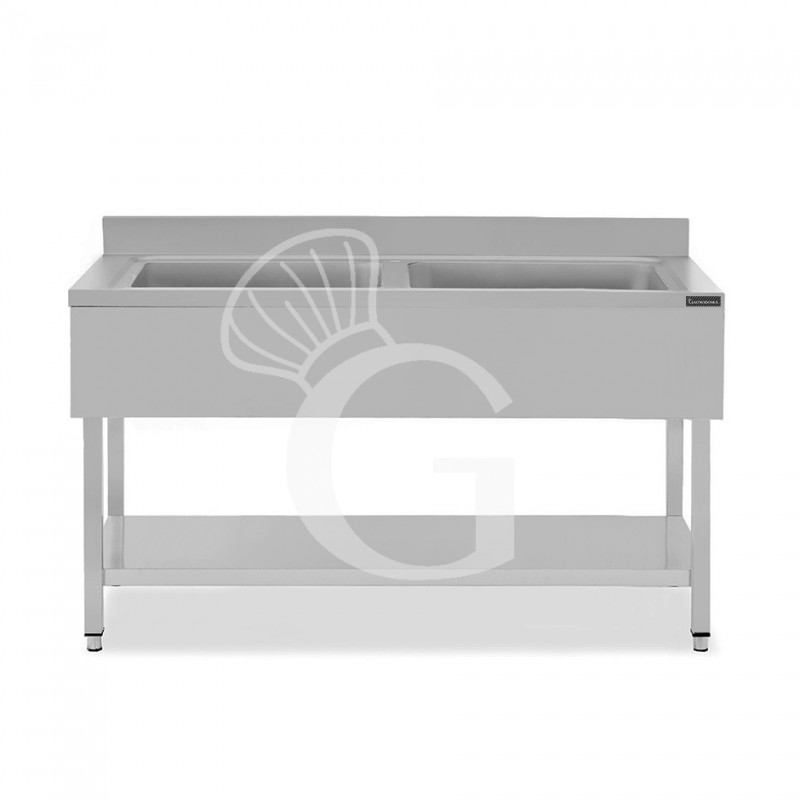 Fregadero para ollas de acero inoxidable con 1 estante, peto trasero, 2 cubas L 1800 mm x P 700 mm x A 950 mm.